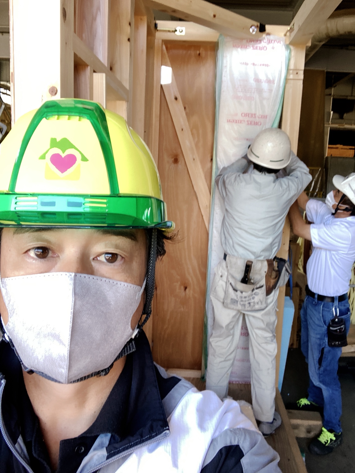 先月断熱材充填の講習に行ってきました。ただ単に柱間に詰め込むのではなく、切り込みを入れたりテープを貼ったりして隙間なく充填するよう講師の方に教えて頂きながら技術を習得しました。