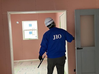 大工さんがボードを貼り終わった状況でぼの張り方、ビスピッチなどを検査していただいております。